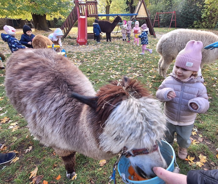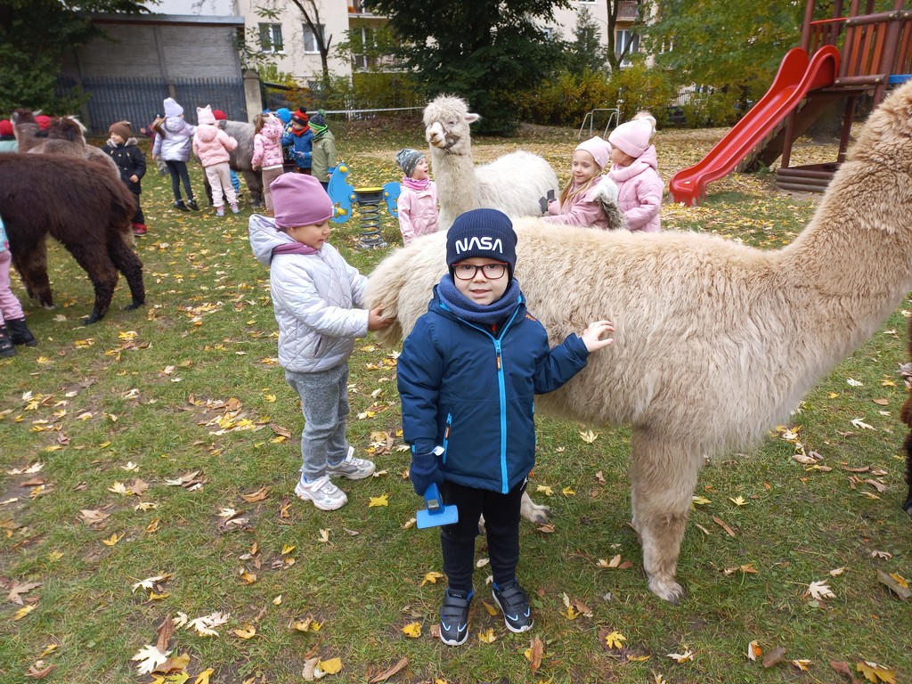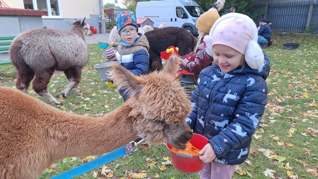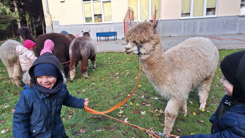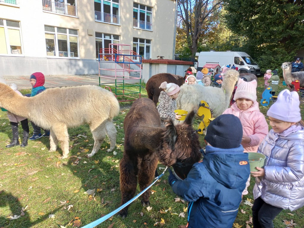 W październiku przyjechały do nas Alpaki z Orzechove AlpakoweLove. Dzieci dowiedziały się jak trzeba opiekować się alpakami i jak wygląda ich hodowla. Karmiły zwierzątka ich przysmakiem (marchewkami), spacerowały z alpakami po ogrodzie, głaskały, przytulały się do ich mięciutkiego futerka i je czesały. Opiekun tych cudnych zwierząt dzieciom starszym opowiadał o życiu alpak w ich naturalnym środowisku i odpowiadał na wszystkie pytania, by zaspokoić ciekawość dzieci.