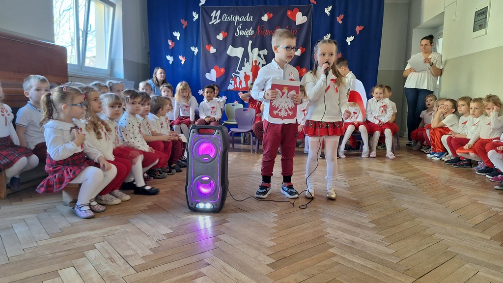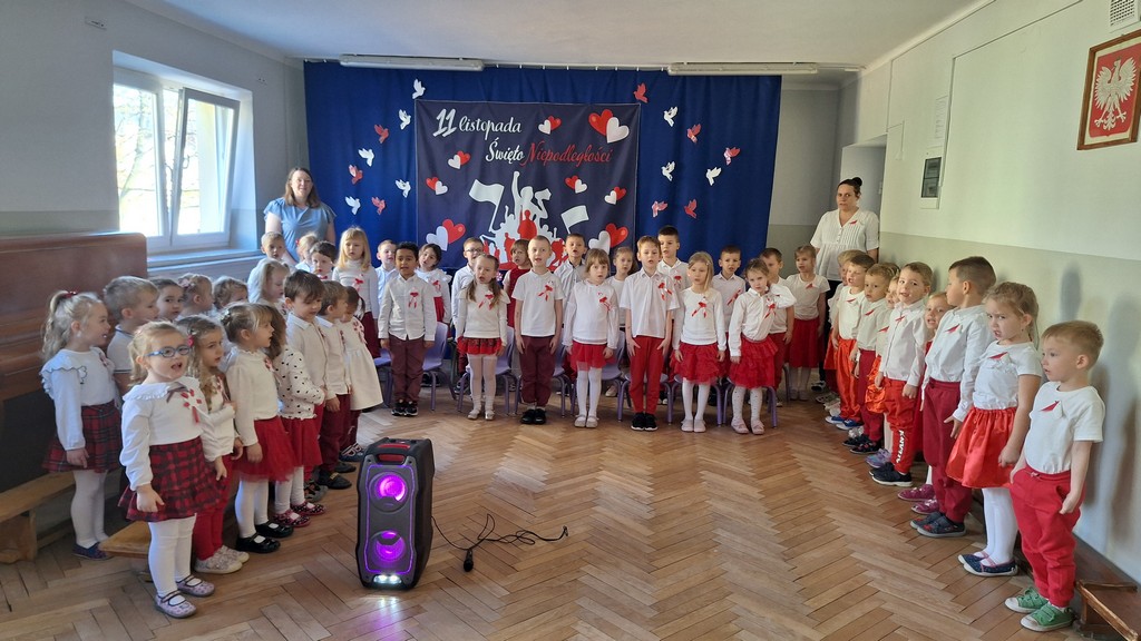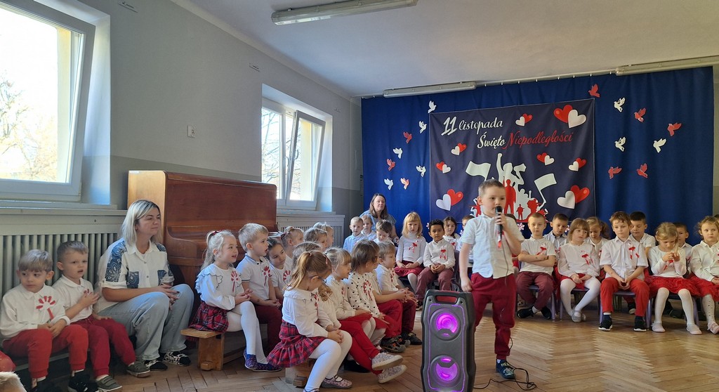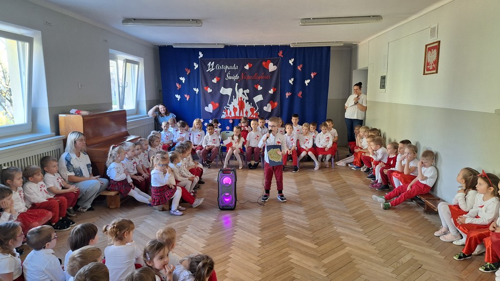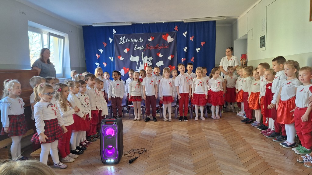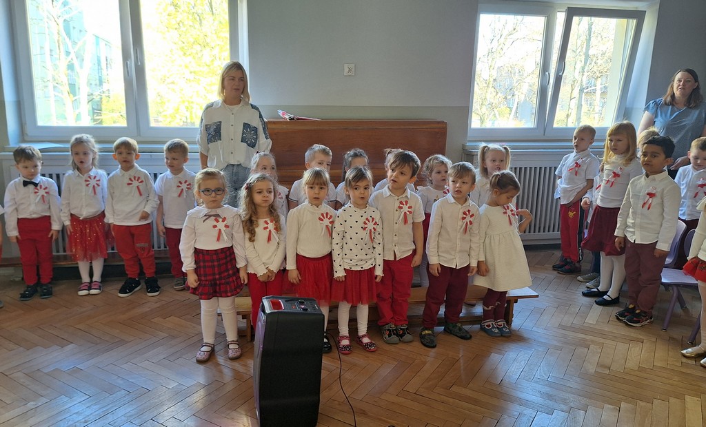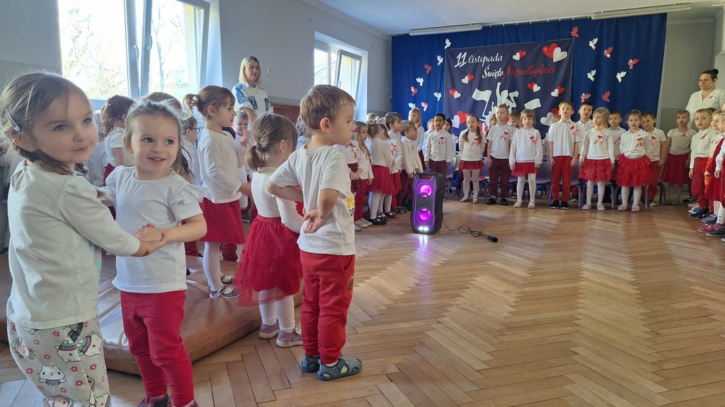Wszystkich zebranych powitała pani Aleksandra zapraszając na program artystyczny w wykonaniu przedszkolaków. Dzieci w wierszach i piosenkach przytoczyły zarys historyczny odzyskania przez Polskę Niepodległości oraz oddały hołd Ojczyźnie . Ponadto nasze przedszkole wzięło udział w akcji organizowanej przez MEN ,,Szkoła do hymnu” podczas której o godzinie 11:11 wszyscy zgromadzeni odśpiewali Hymn Narodowy. Uroczystość ta z pewnością zapadnie wszystkim głęboko w pamięci. Dzień, który przeżyliśmy dumnie i z uśmiechem na twarzy, przyczyni się do kształtowania patriotycznych postaw naszych małych Polek i Polaków.