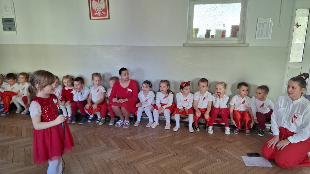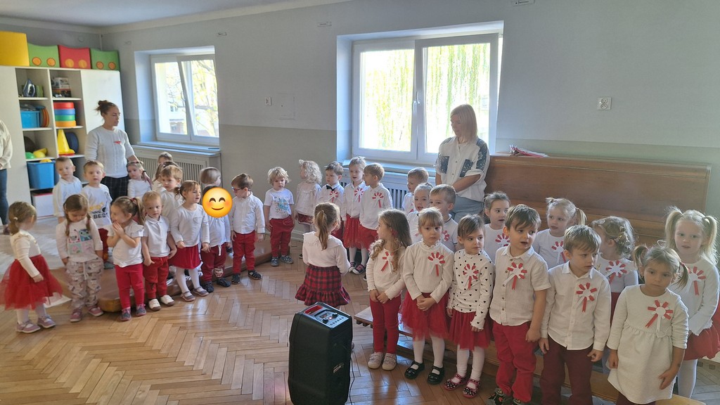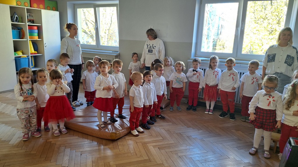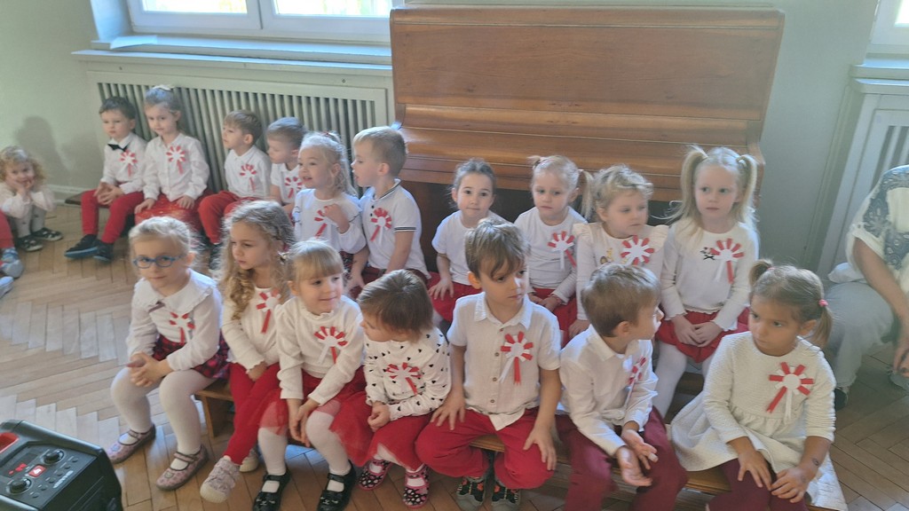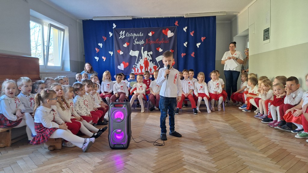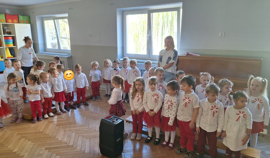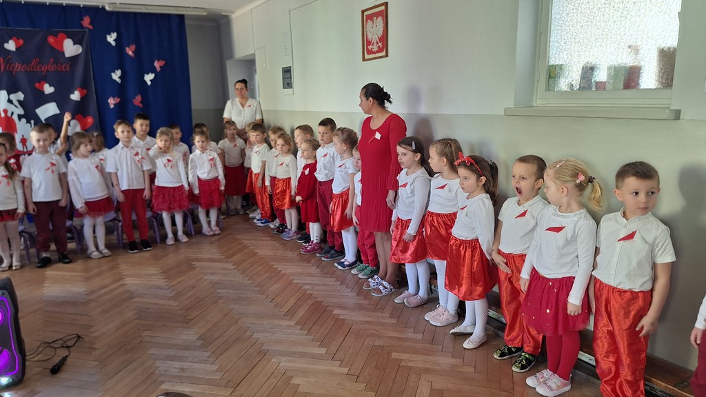 Wszystkich zebranych powitała pani Aleksandra zapraszając na program artystyczny w wykonaniu przedszkolaków. Dzieci w wierszach i piosenkach przytoczyły zarys historyczny odzyskania przez Polskę Niepodległości oraz oddały hołd Ojczyźnie . Ponadto nasze przedszkole wzięło udział w akcji organizowanej przez MEN ,,Szkoła do hymnu” podczas której o godzinie 11:11 wszyscy zgromadzeni odśpiewali Hymn Narodowy. Uroczystość ta z pewnością zapadnie wszystkim głęboko w pamięci. Dzień, który przeżyliśmy dumnie i z uśmiechem na twarzy, przyczyni się do kształtowania patriotycznych postaw naszych małych Polek i Polaków.