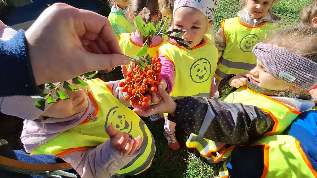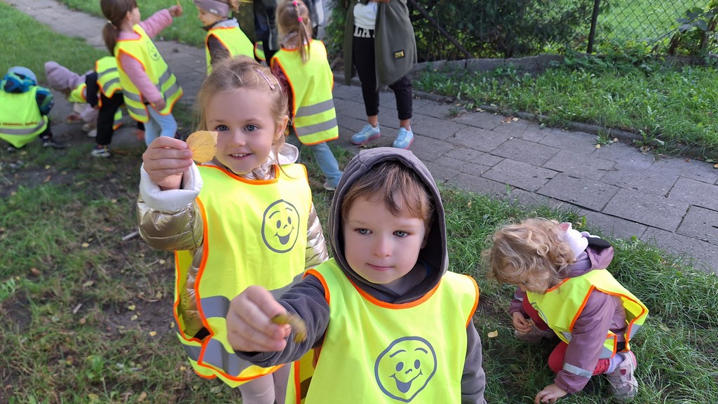 By utrwalić wiedze o skarbach jesieni we wrześniu wybraliśmy się na spacer. Naszym celem był kasztanowiec i zbieranie kasztanów, ale po drodze zaglądaliśmy do ogródków, oglądaliśmy i nazywaliśmy drzewa, zbieraliśmy liście. W tym roku jesień jest niezwykle kolorowa.