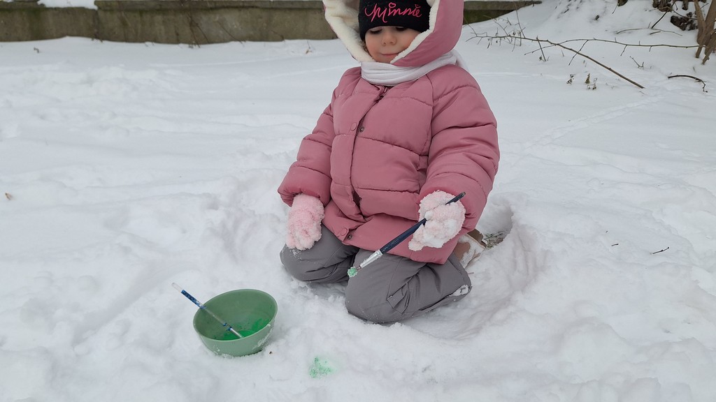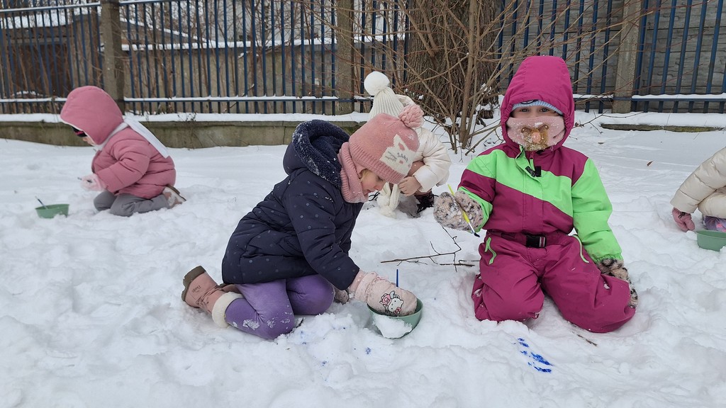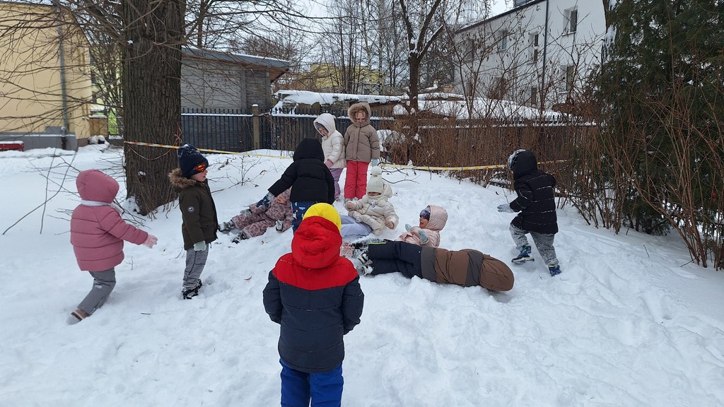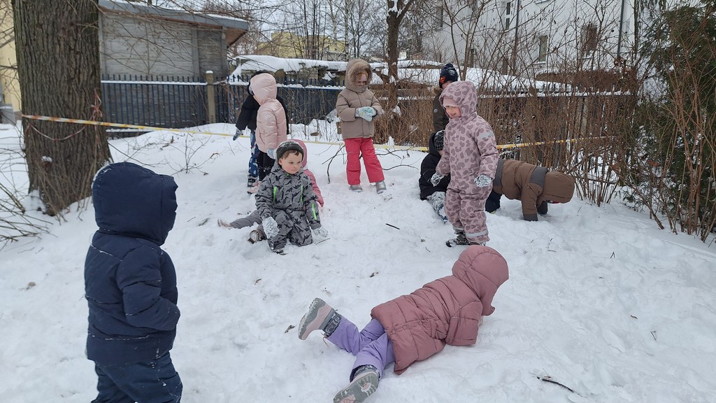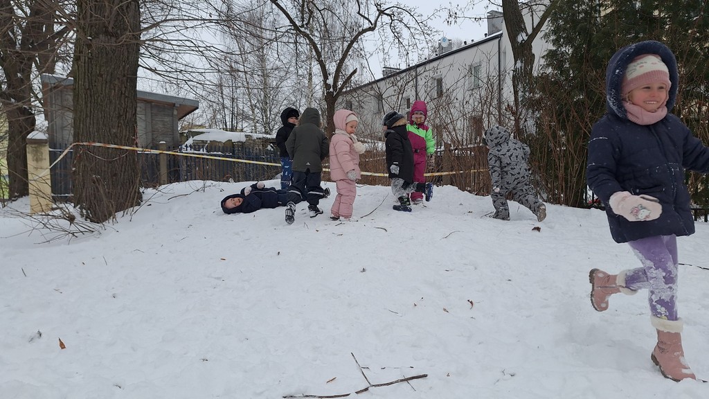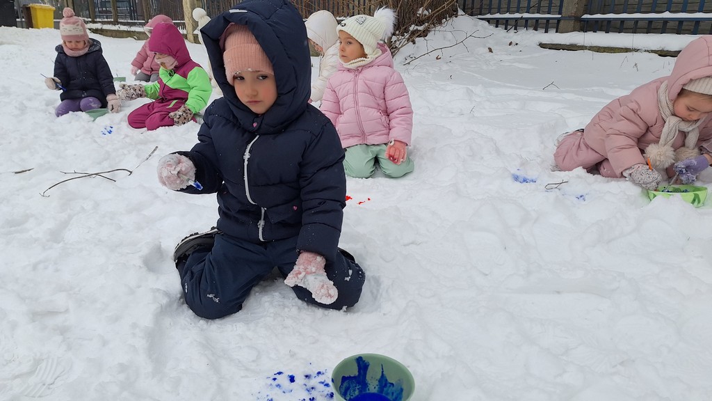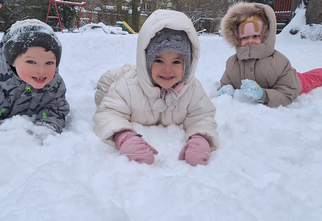 Korzystając z fantastycznej zimowej aury spędziliśmy kilka dni na fantastycznej zabawie w naszym ogrodzie. Tym razem było wyjątkowo biało i zupełnie inaczej niż zawsze. Robiliśmy na śniegu aniołki, traktorki, zajączki. Zbiegaliśmy z górki na pazurki, a nawet turlaliśmy się z górki. Rzucaliśmy się śnieżkami i podrzucaliśmy puszysty śnieg. Było dużo śmiechu i radości. Ostatniego dnia sprzyjającej pogody malowaliśmy śnieg farbami i rozwiązywaliśmy zagadkę czy śnieg jest czysty. Następnym razem zorganizujemy sobie sanki.